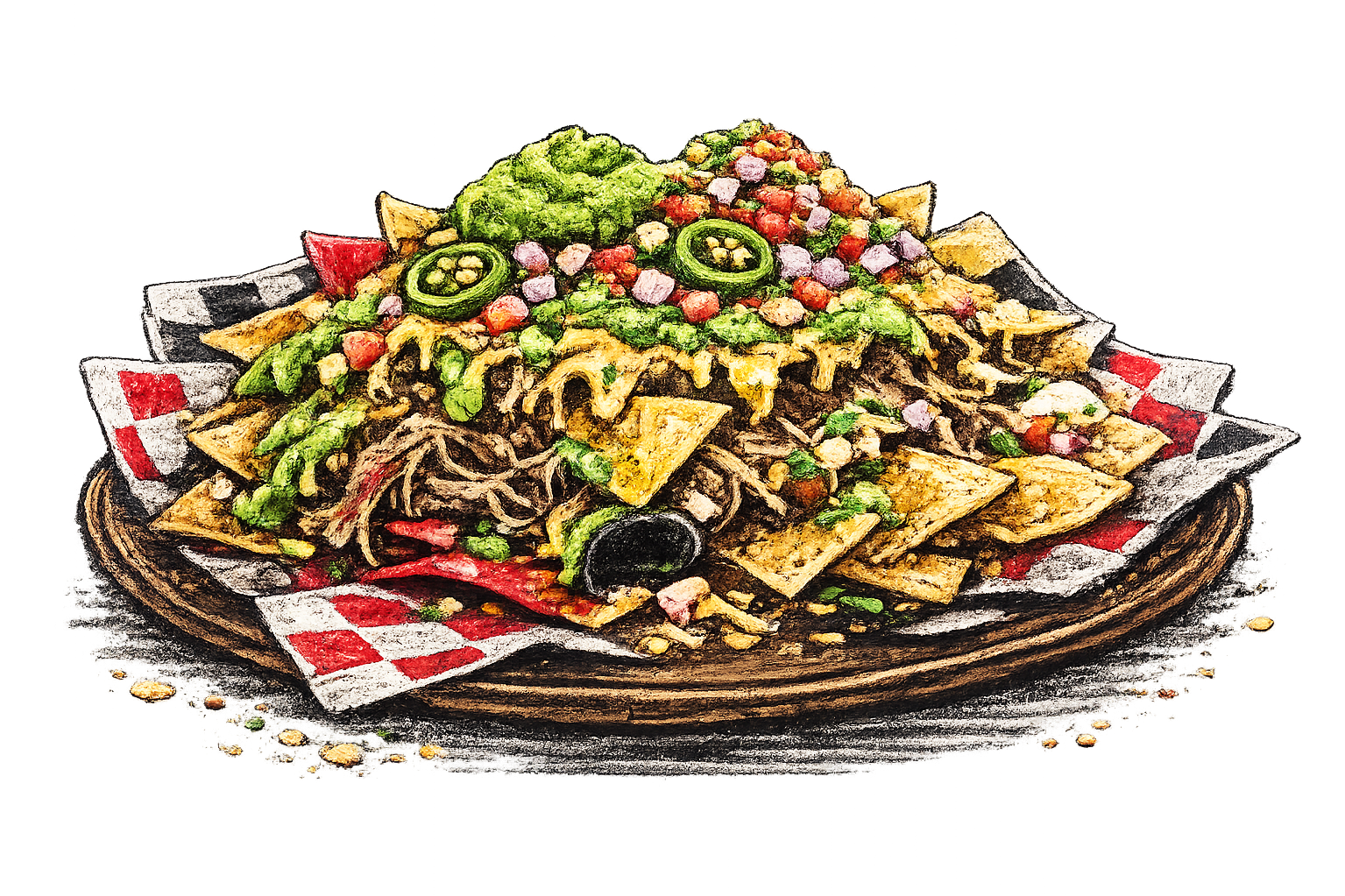 Kalua Pig Nachos – Hawaiian-style pulled pork, crispy tortilla chips, shredded cheese, diced onion, salsa, guacamole, sour cream, and sliced jalapeños. | $14.00